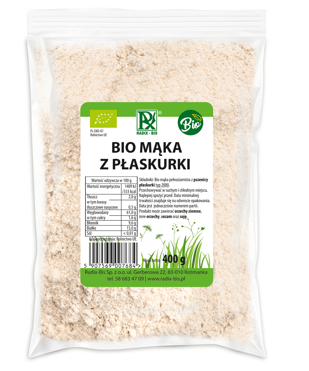 Składniki: Bio mąka pełnoziarnista z pszenicy płaskurki typ 2000